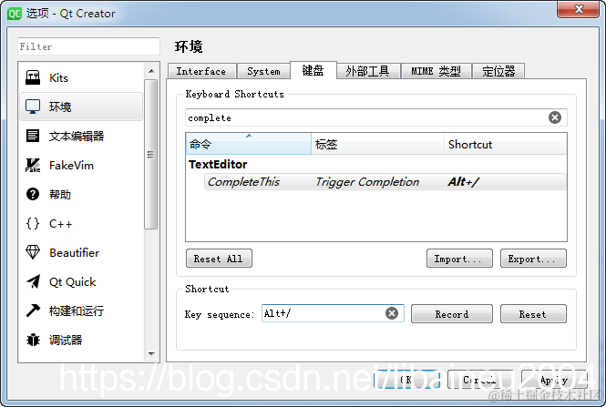 3、修改其中的【CompleteThis】命令,把快捷键【Ctrl】+【Space】 改为 【Alt】+【/】