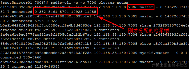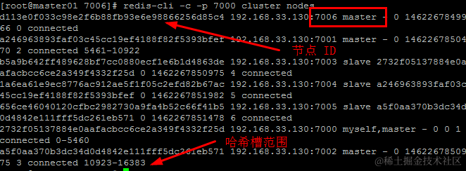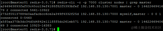 - redis-cli -c -p 7000 cluster nodes [| grep master]