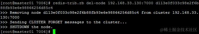- redis-trib.rb del-node 192.168.33.130:7000 d113e0f033c98e2f6b88fb93e6e98866256d85c4 //最后一个参数为需要删除的节点ID