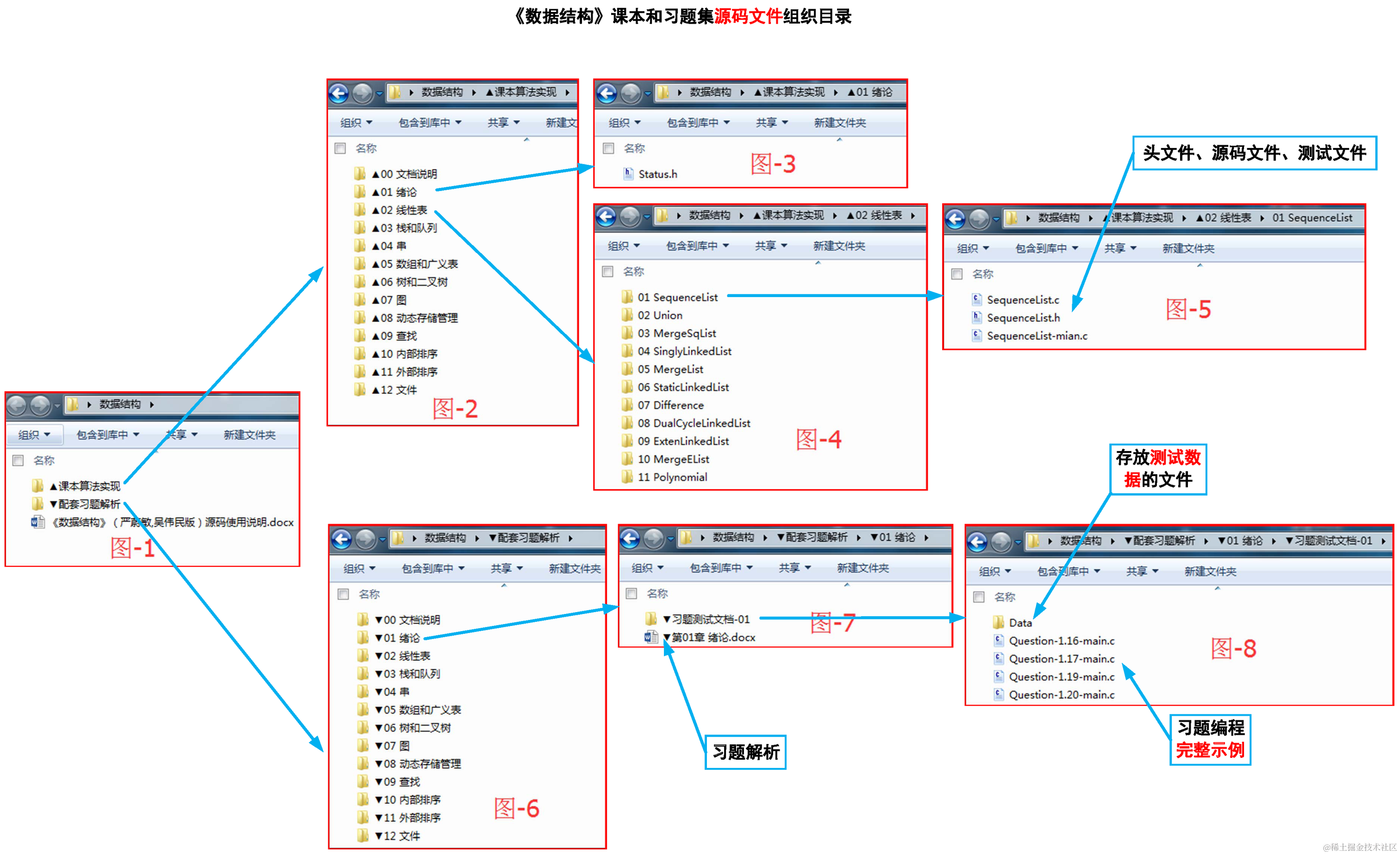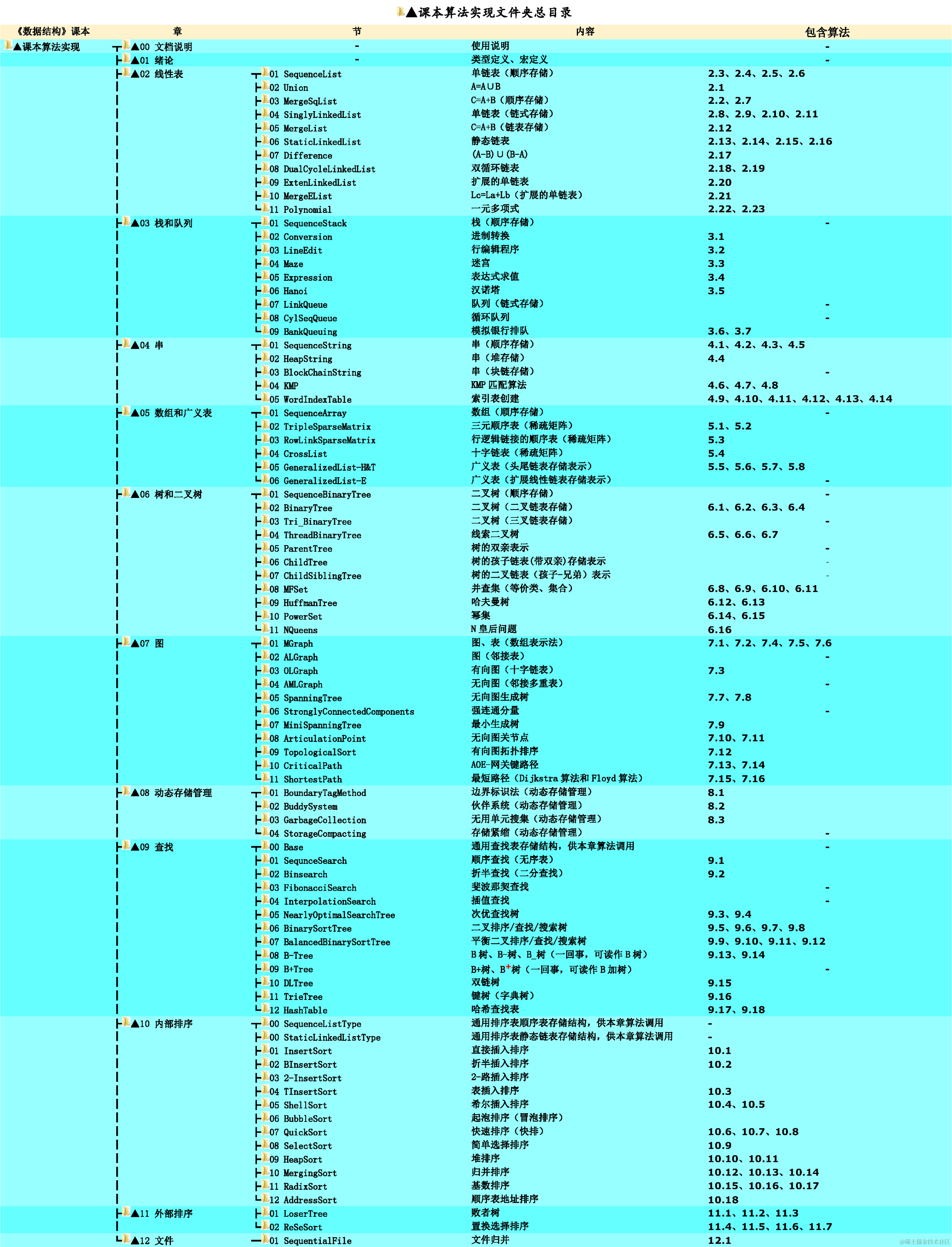 附一:《数据结构》课本源码《▲课本算法实现》目录下的文件组织方式,《▼配套习题解析》部分的组织方式与此类似,只不过每一章内部存放的是习题解析和测试文档。