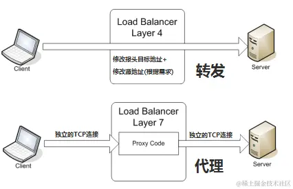 七层负载均衡:负载均衡器与客户端及后端的服务器会分别建立一个TCP连接。即两次TCP连接。
