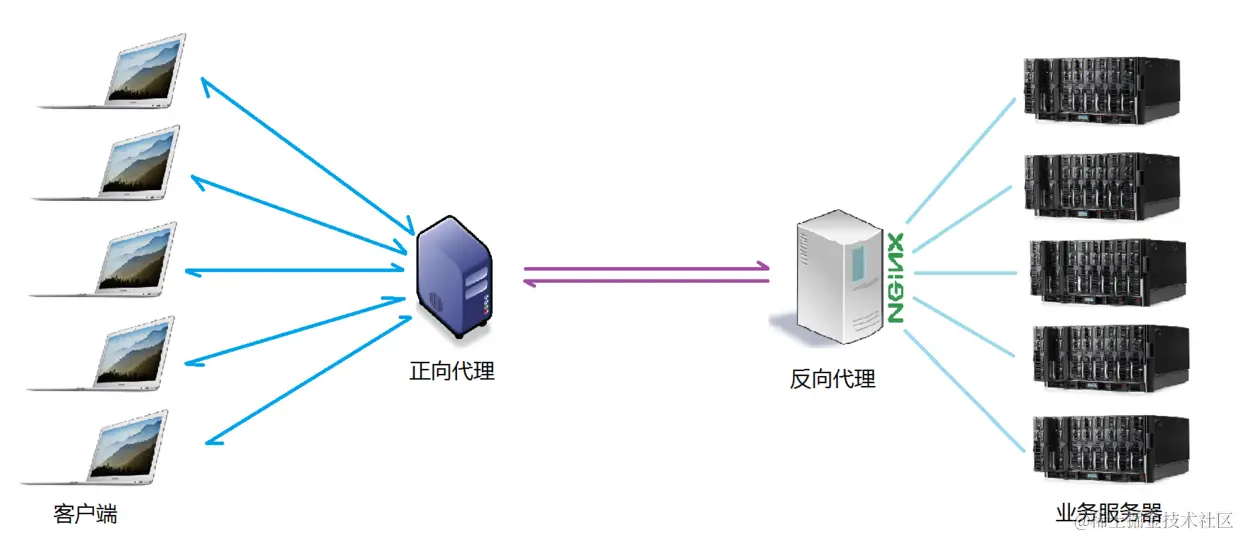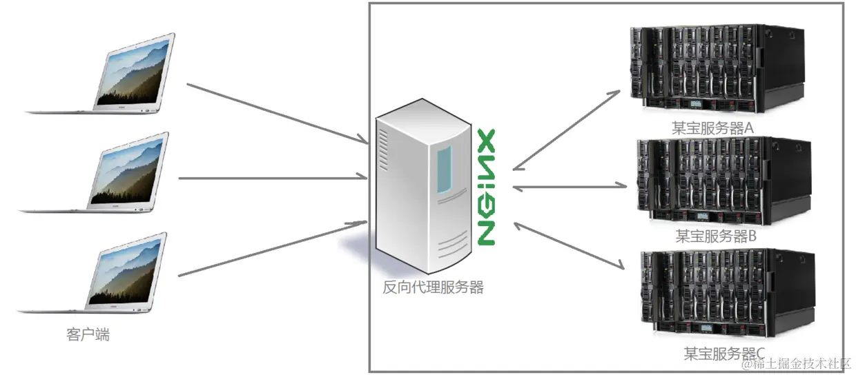 通过上述的图解大家就可以看清楚了,多个客户端给服务器发送的请求,nginx服务器接收到之后,按照一定的规则分发给了后端的业务处理服务器进行处理了。此时~请求的来源也就是客户端是明确的,但是请求具体由哪台服务器处理的并不明确了,nginx扮演的就是一个反向代理角色