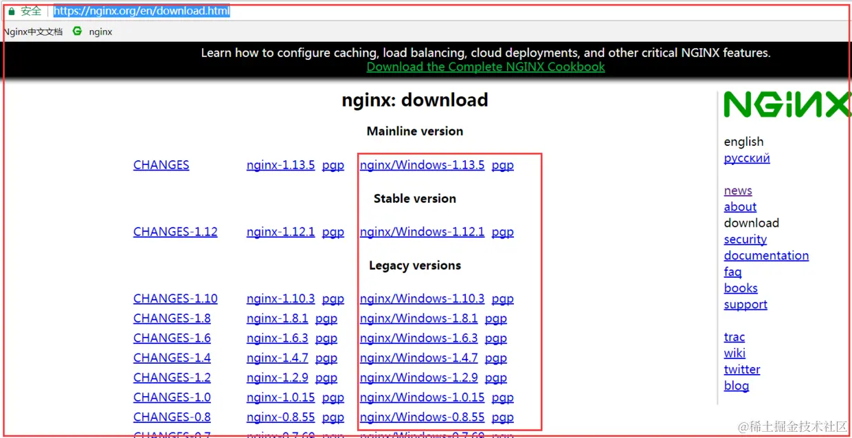如下图所示,下载对应的版本的nginx压缩包,解压到自己电脑上存放软件的文件夹中即可