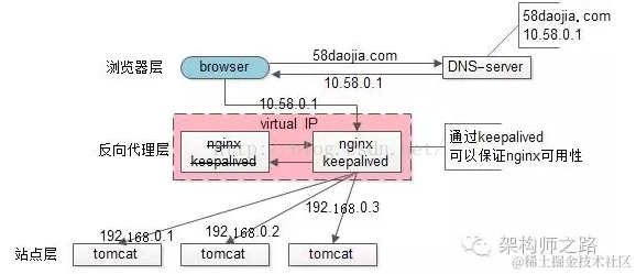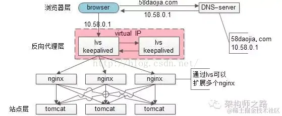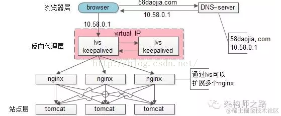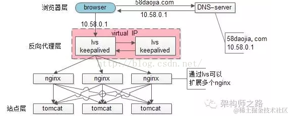 末了,上一篇文章有同学留言问58到家采用什么方案,58到家目前部署在阿里云上,前端购买了SLB服务(可以先粗暴的认为是一个lvs+keepalived的高可用负载均衡服务),后端是nginx+tomcat。