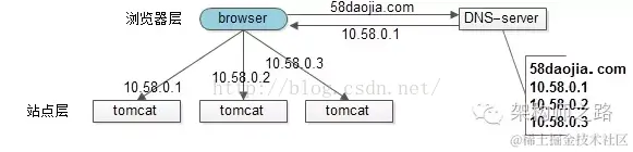 假设tomcat的吞吐量是1000次每秒,当系统总吞吐量达到3000时,如何扩容是首先要解决的问题,DNS轮询是一个很容易想到的方案: