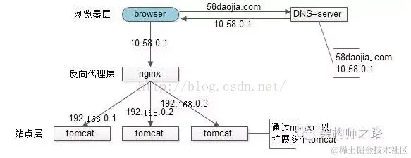 1)站点层与浏览器层之间加入了一个反向代理层,利用高性能的nginx来做反向代理