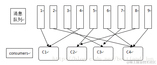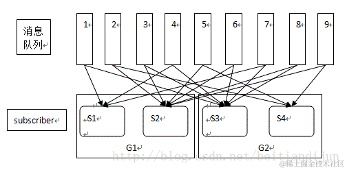 若是所有consumer实例属于相同的consumer组,则这种模式就是传统消息队列模式,在所有consumers之间进行负载均衡。
