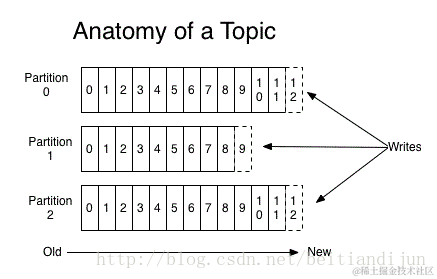 topic可以认为是消息流的不同类别。不同的消息根据就是通过不同的topic进行分类或者汇总,然后producer将不同分类的消息发往不同的topic。对于每一个topic,kafka集群维护一个分区的日志:如图所示:\