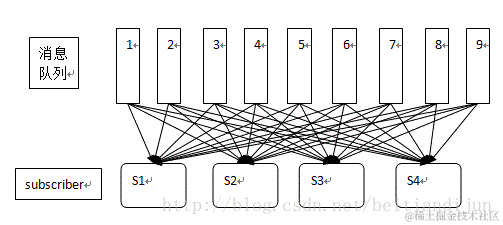 若是所有consumer实例属于不同的consumer组,则这种模式就是发布-订阅模式,所有消息都会广播到所有consumer。