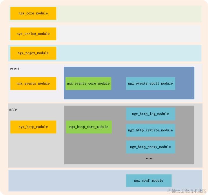 Nginx有非常多的模块,同时如果有需要,可以自己定制一些模块,整体上,模块之间的关系可以按照下图所示: