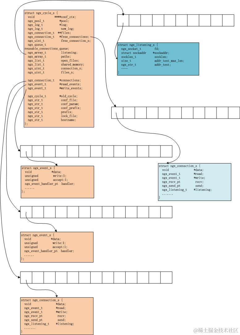 1、从结构图中,我们先看第一部分,NGINX拿到socket标示符,绑定本地地址,监听socket标示符信息,由于NGINX支持多server,支持各个server使用不同的端口、不同的协议族。如此需要多个socket句柄来支持,NGINX利用ngx_listening_t这个数据结构来保存打开的socket信息并且放置在一个数组里面。这个过程是在初始化cycle中完成的。