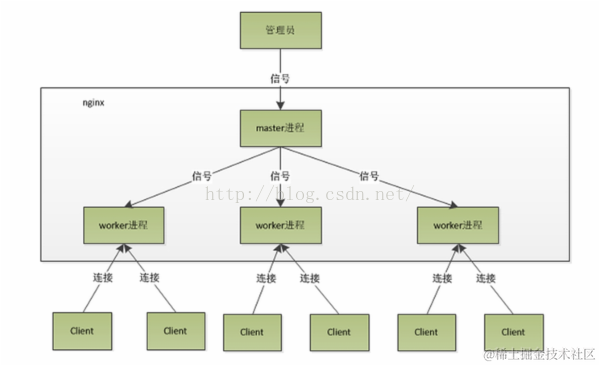 Master/Worker结构:一个master进程,生成一个或多个worker进程(网上找的图):