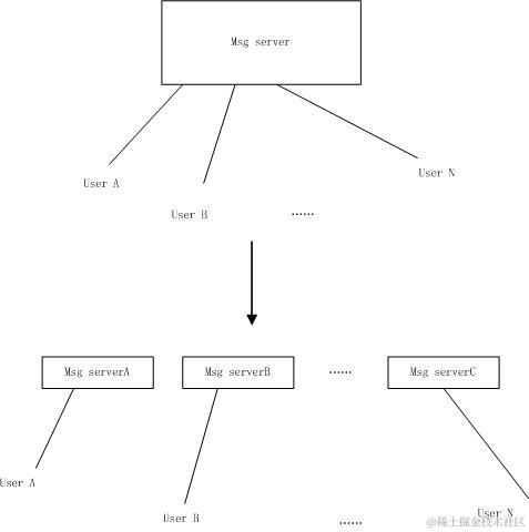 对于一个即时通信服务器来说,在用户量少的时候,一台服务器就足以提供所有的服务。而这种架构也最简单,举个例子,用户A与用户B互为好友,A向B发消息,服务器接收到消息时,解析出接收消息的人,直接转发给B即可。可是当用户数量越来越多时,一台服务器已经无法所有用户的需求,这时就要进行服务扩容,进行分布式部署