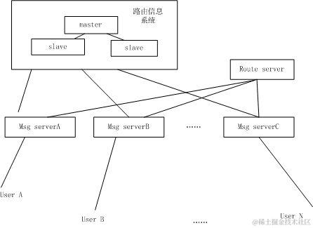 那么如何解决这个问题呢?试想一下,既然所有的msg server上都保存着同样的路由信息,那么我们可以把这些数据从msg server剥离出来,存在一个单独的服务器上,供msg server查询。我们暂且把这个服务器叫做route info server(路由信息服务器).对于一个用户要存储的数据为