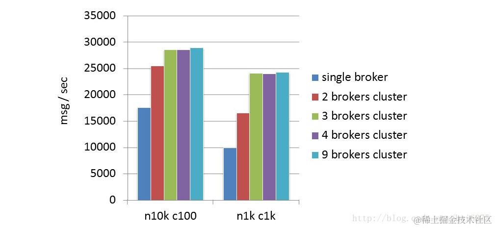 在1台broker、2台broker、3台broker、4台broker、9台broker的情况下分别测试集群的整体吞吐率,从1台broker到3台broker时整体吞吐率逐渐增长,增长系数大概在0.8左右,broker超过3台时整体吞吐率由于压测工具的瓶颈而停止增长。