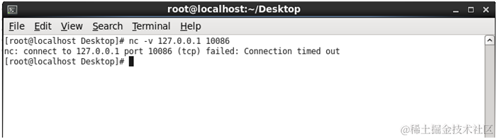 2. 然后通过nc命令向本地的环回地址127.0.0.1发起tcp连接请求(相当于自己跟自己发起tcp连接),来模拟客户端跟服务端发起tcp连接,但是服务器端就是不响应,最后导致客户端的tcp连接建立请求超时,并终止tcp连接。
