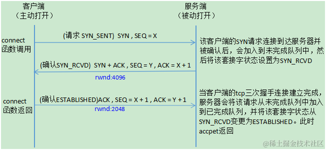 已完成队列:即刚刚完成tcp三次握手的tcp连接,这些套接字处于ESTABLISHED状态,服务器会将这些套接字加入到已完成队列。