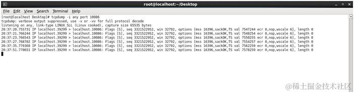 3. 然后再通过tcpdump工具把客户端和服务端建立tcp连接过程中的数据报都抓取下来,由于我们设置的服务器侦听端口号是10086,这里我们可以通过tcpdump -i any port 10086命令来过滤所有网卡的10086端口的数据包。如上图所示,localhost.39299代表客户端,localhost.10086代表服务端,客户端总共向服务端发送了6个SYN报文,这6个SYN包的间隔时间分别是1s,2s,4s,8s,16s,这些时间累积加起来总共为31s,其实客户端在发送最后一个SYN报文时还等待了一段时间,然后才超时。也就是说,客户端在发送了第一个SYN报文时,会设置了一个计时器并开始计时,在最后一个SYN报文还没收到服务端的确认时,这个计时器就会超时,然后关闭tcp连接。