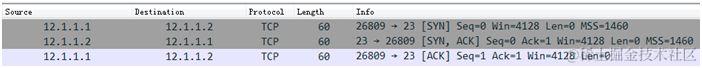下面是我们通过wireshark抓取到的tcp三次握手的数据包: