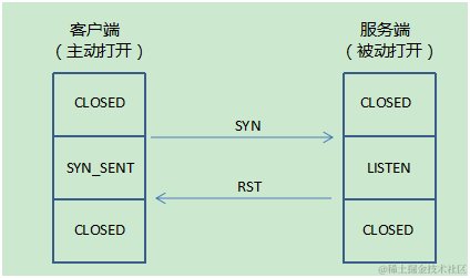 拒绝连接一般是由服务器主动发起的,因为客户端发起请求连接携带的目的端口,可能服务器并没有开启LISTEN状态。因此服务器在收到这样的报文段后会发送一个RST报文段,在这个报文里把RST和ACK都置为1,它确认了SYN报文段并同时重置了该tcp连接,然后服务器等待另一个连接。客户端在收到RST+ACK报文段后就会进入CLOSED状态。