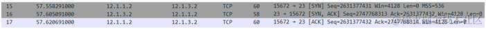 在正式介绍connect函数时,我们先来看一下tcp三次握手的过程,下面这个实验是客户端通过telnet远程登录服务端的例子,telnet协议是基于tcp协议,我们可以通过wireshark抓包工具看到客户端和服务端之间三次握手的过程,12.1.1.1是客户端的ip地址,12.1.1.2是服务端的ip地址。