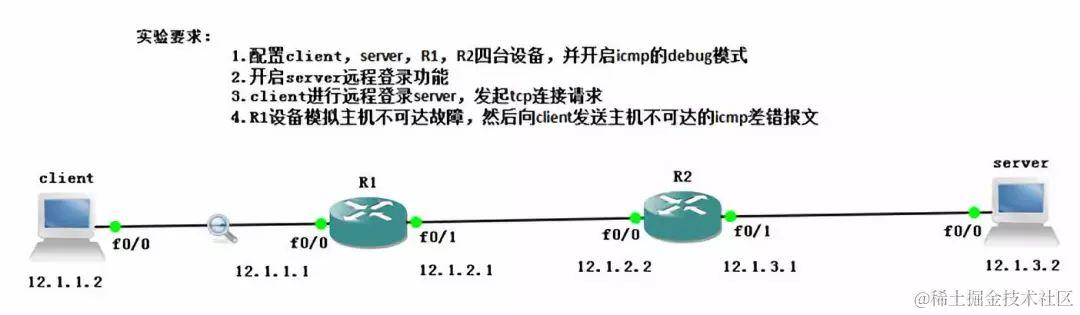 client再登录server时就会失败,我们从抓取到的数据包可以发现,client发送了一个SYN报文,然后R1设备收到这个SYN报文时,发现自己不能到达server,于是会把这个SYN报文丢弃掉,并向client发送了一个目标主机不可达的ICMP差错报文,于是client发送了RST报文来关闭这条异常的tcp连接。