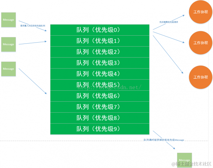出现故障的这个业务是一个接受手机端订阅请求的业务,手机端在订阅请求超时后(大概30s),会重新尝试发起请求。由于当时系统过载,处理速度慢于请求速度,大量请求积压在队列中,随着时间的推移,服务处理请求的响应速度越来越慢,最终导致很多请求还没处理完手机端就认为超时了,重新发起了第二次请求,形成雪崩效应。当时紧急增加了一些服务器,恢复了故障,事后总结下来发现,事件的主因还是因为我们没有做好过载保护机制。于是我们决定在Kiev中内置过载保护功能,增加一个分为10个优先级的过载保护队列。每个请求到达时先进入过载保护队列,而后由工作协程(work-coroutine)取出请求进行处理。当过载保护队列堆满时,队列中删除一个最低优先级的请求,腾出一个空位。同时,队列中的请求也是有时效性的,过长时间未能被处理的请求会被丢弃掉,以此避免处理已超时的请求。如下图所示: