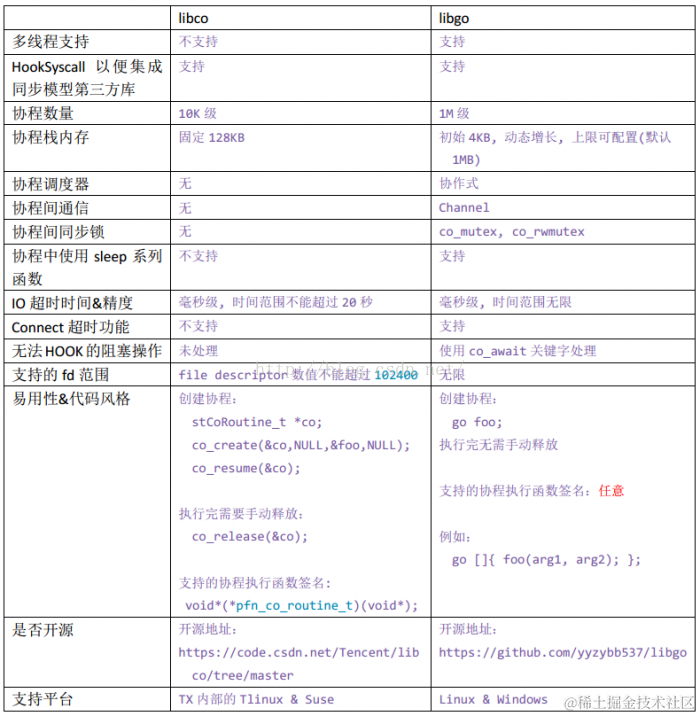 随着机器越来越多,以及后续出现了一些超长链路请求的业务形态(这里解释一下长链路请求的问题,长链路请求是指一个请求要流经很多服务处理,在处理流程中,前面的服务一定要等到后面的服务全部处理完成或超时,才会释放其占用的TCP连接,这样的模式会极大地影响整个系统的请求并发数),TCP连接数方面的压力越来越大,最终不得不考虑改为单连接上使用全双工模式。然而当时使用的libco功能过于简单,很难基于此开发全双工模式的RPC框架,恰好当时有一位同事在github上做了一个叫libgo的开源项目,是一个和golang语言一样的CSP并发模型的协程库,于是我们做了一段时间的技术预研,看看能否替换掉现有的libco. 下面的表格是两个项目在我们比较关心的一些维度上的对比: