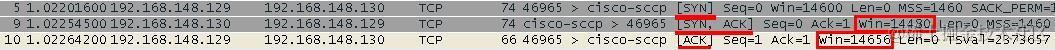 TCP连接建立之时的收端的初始接受窗口大小是14600,细节如图2所示(129是收端,130是发端)