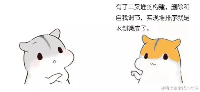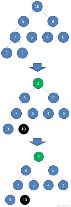 当我们删除一个最大堆的堆顶(并不是完全删除,而是替换到最后面),经过自我调节,第二大的元素就会被交换上来,成为最大堆的新堆顶。