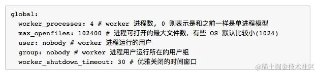 除了worker_shutdown_timeout其他几个配置应该比较好理解。worker_shutdown_timeout 是配置老 worker 在收到退出信号后多长时间退出。这个配置是跟多进程实现相关的参数,我们是通过启动新进程替代老进程的方式来实现配置以及进程数目的在线修改,所以这个配置就是用来指定老进程的保留时间。
