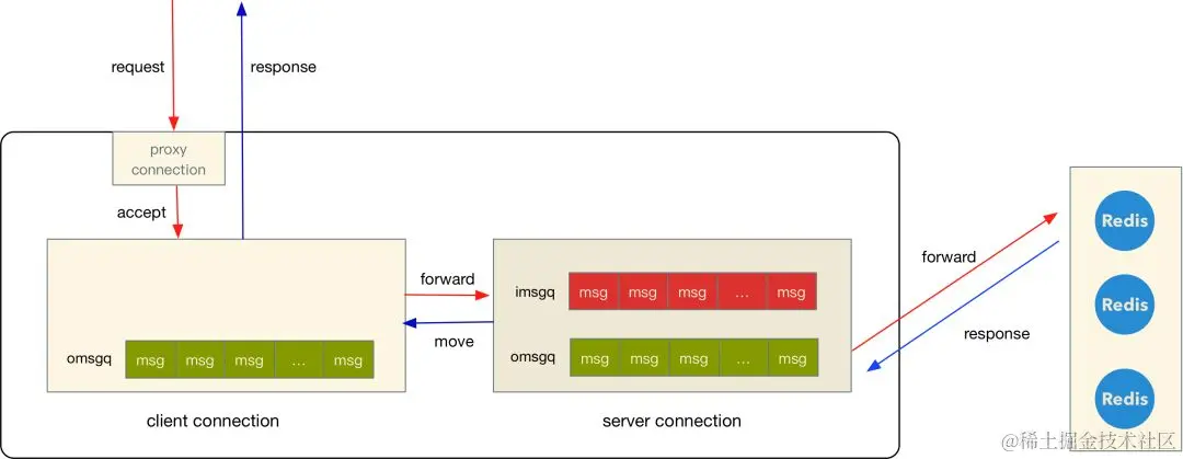 - 最后将响应内容放到 client connection 的 omsgq,由 client connection 将数据发送回客户端。