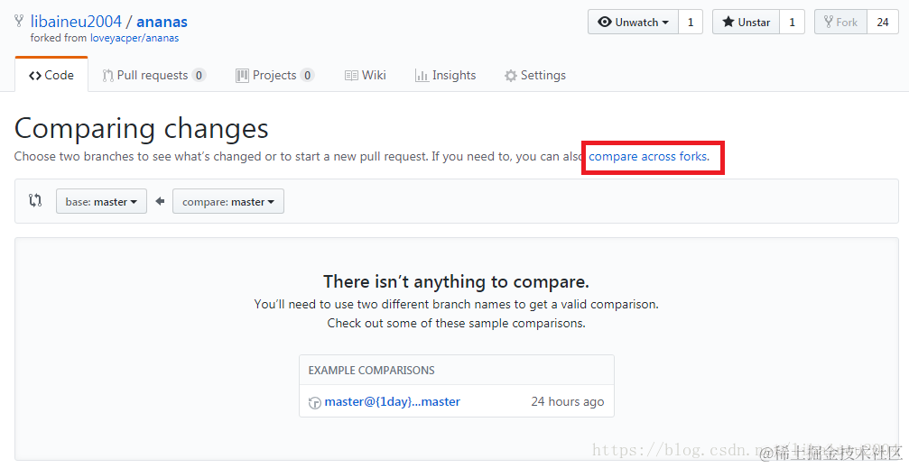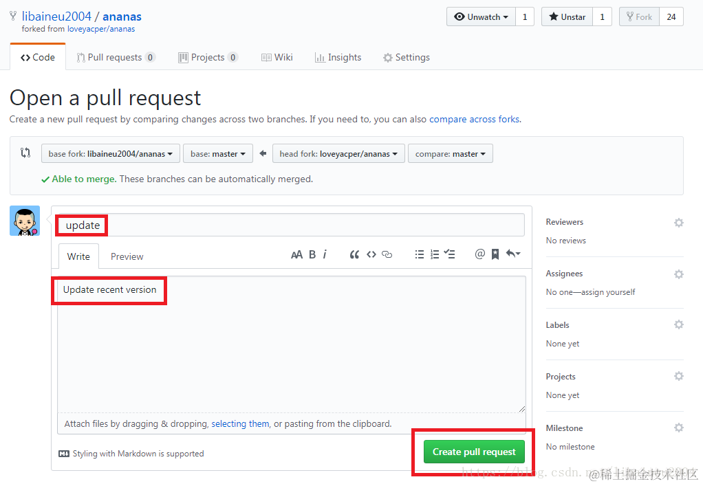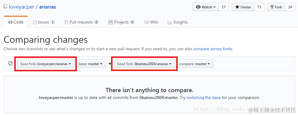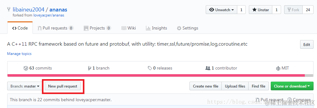 好工具推荐系列:github上fork了别人的项目后,再同步更新新的版本(★firecat个人实践★) firecat全宏 2021-05-18 285 阅读1分钟 举例如下: libaineu2004是本人,loveyacper是ananas项目的作者。 步骤1:点击New pull request按钮 步骤2:默认左边是原创版本,右边是fork版本 步骤3:我们需要把他们左右调换过来 步骤4:使得左边是fork版本,右边是原创版本,然后点击“Create pull request”按钮 步骤5:填写升级信息 步骤6: 步骤7: ok,搞定!