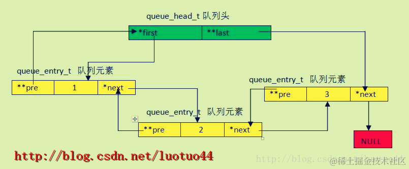 图中,一级指针指向的是queue_entry_t这个结构体,即存储queue_entry_t这个结构体的地址值。二级指针存储的是一级地址变量的地址值。所以二级指针指向的是图中的一级指针,而非结构体。图中的1,2, 3为队列元素保存的一些值。