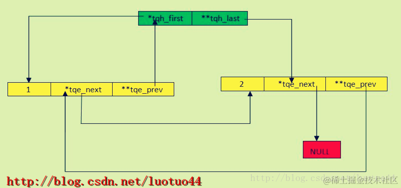 虽然本文最前面的图布局更好看一点,但这张图才更能反映文中这两个结构体的内存布局。不错,tqe_next是在tqe_prev的前面。这使得tqe_next、tqe_prev于tqh_first、tqh_last的内存布局一样。一级指针在前,二级指针在后。