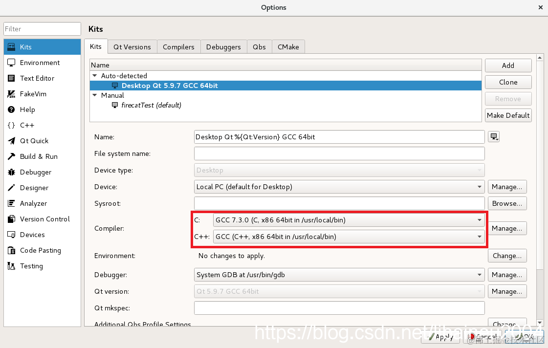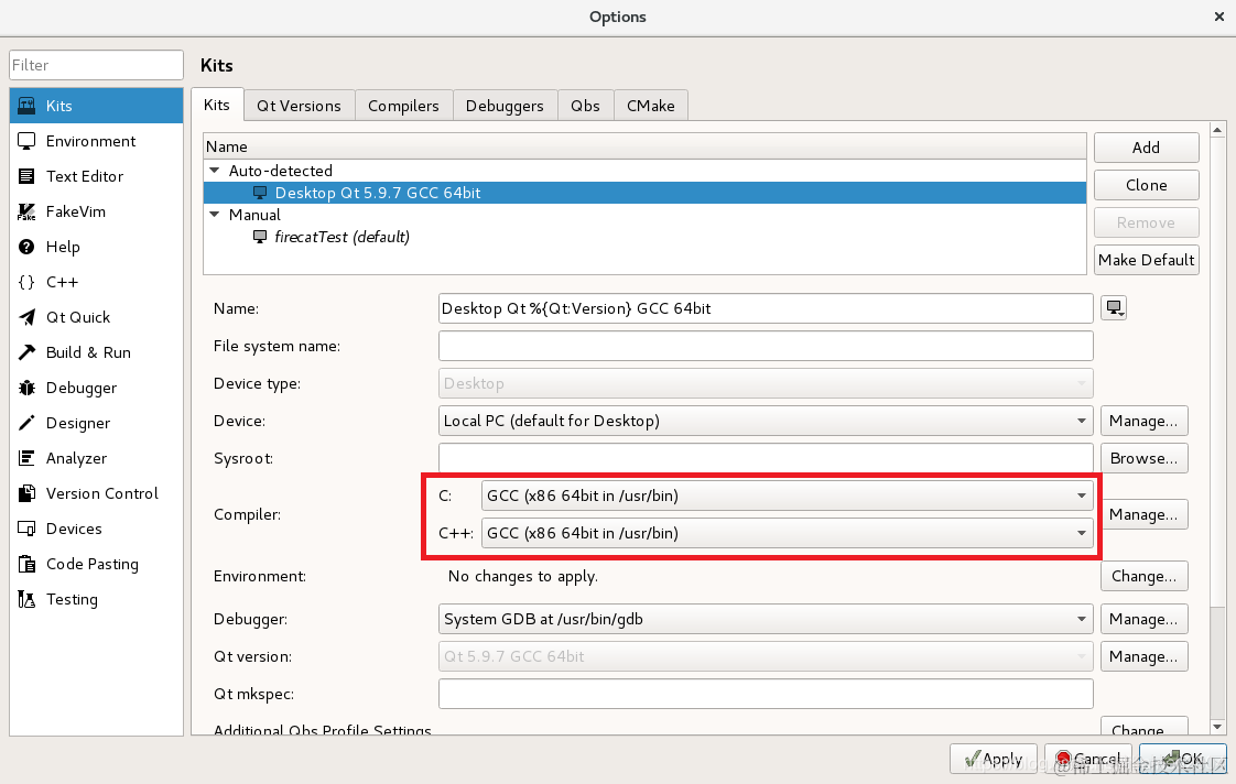 五、笔者cmake版本是3.13.0,平时习惯用Qt Creator作为IDE开发项目。gcc升级之后,相应的配置需要调整: