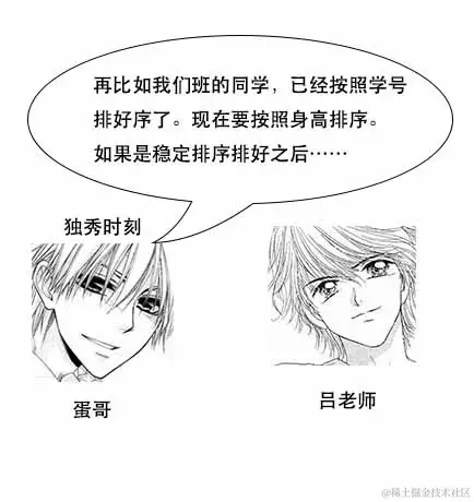 蛋哥:再比如我们班的同学,已经按照学号排好序了。现在要按照身高排序。如果是稳定排序排好之后,身高相同的同学,还是按照学号顺序的。