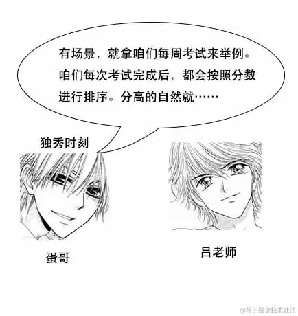 蛋哥:咱们每次考试完成后,都会按照分数进行排序。分高的自然就是第一名。分数相同的同学怎么办呢?那就是按照上次的分数来分高低。上次分高的排在前面。