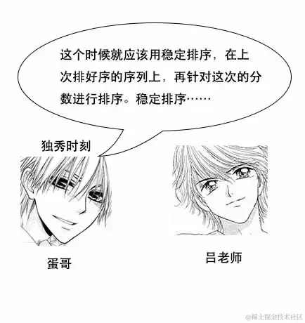 蛋哥:这个时候就应该用稳定排序,在上次排好序的序列上,再针对这次的分数进行排序。稳定排序的结果能保证这次相同分数的人,上次分高的在前面。