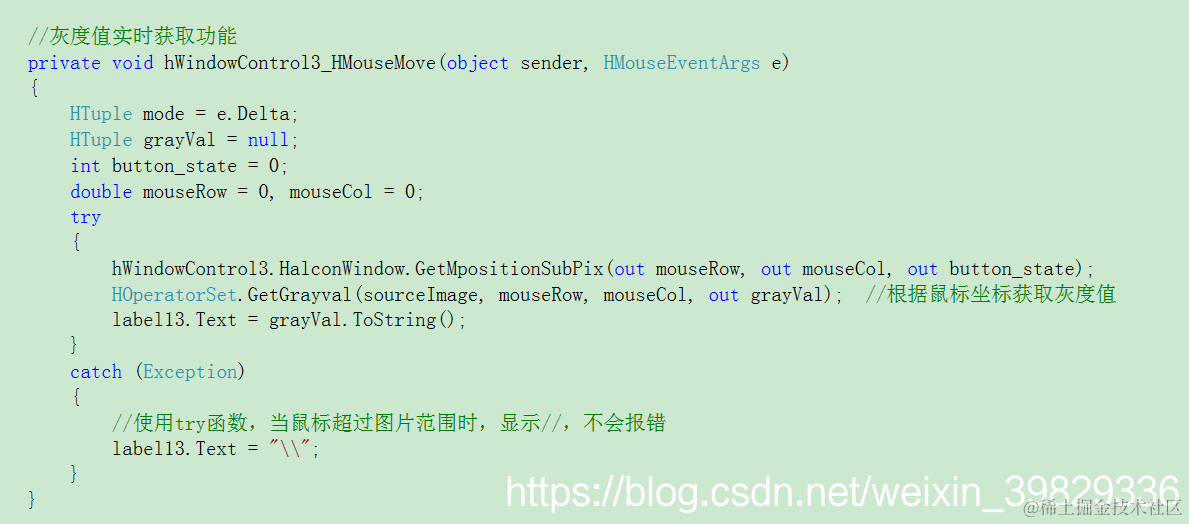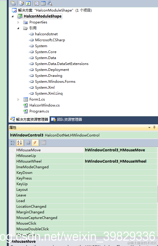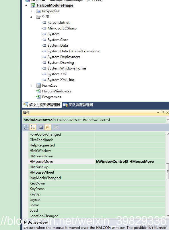 点击halconwindow窗口,查看事件,在HMouseMove事件后面鼠标双击,生成鼠标移动事件,通过鼠标移动来获取灰度值