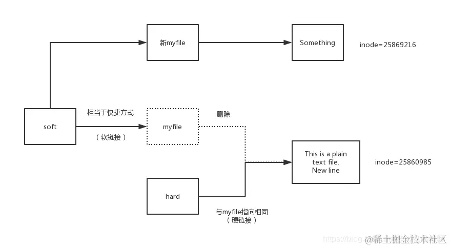 1、当删除myfile时,相当于删除了myfile以及myfile指向空间的指针,此时因为还存在hard,所以这块存储空间不会被回收