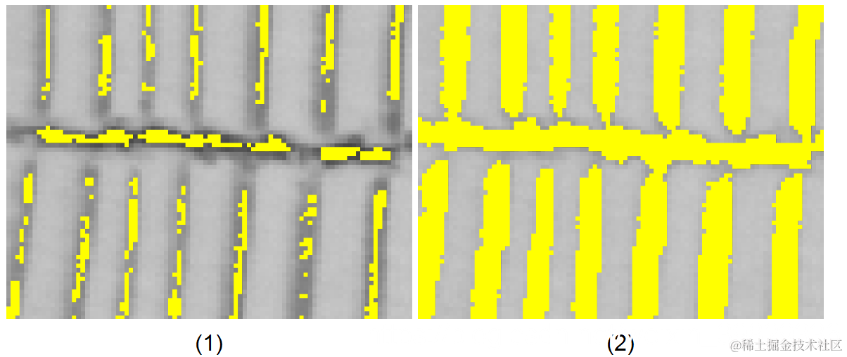 图(1)是StdDevScale的值过于小,导致很多像素没有被选中,图(2)是值过大,导致不需要的像素值被选中;