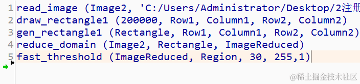 read_image (Image2, 'C:/Users/Administrator/Desktop/2注册图片.bmp') draw_rectangle1 (200000, Row1, Column1, Row2, Column2) gen_rectangle1 (Rectangle, Row1, Column1, Row2, Column2) reduce_domain (Image2, Rectangle, ImageReduced) mean_image (ImageReduced, ImageMean, 10,10) dyn_threshold (ImageReduced, ImageMean, RegionDynThresh,5, 'light')