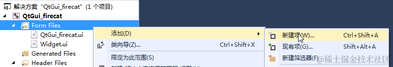 VS版本的qt是否没有新建Qt设计师界面类的选项?是,只能新建.ui文件,但是界面类的.cpp和.h需要自己实现。