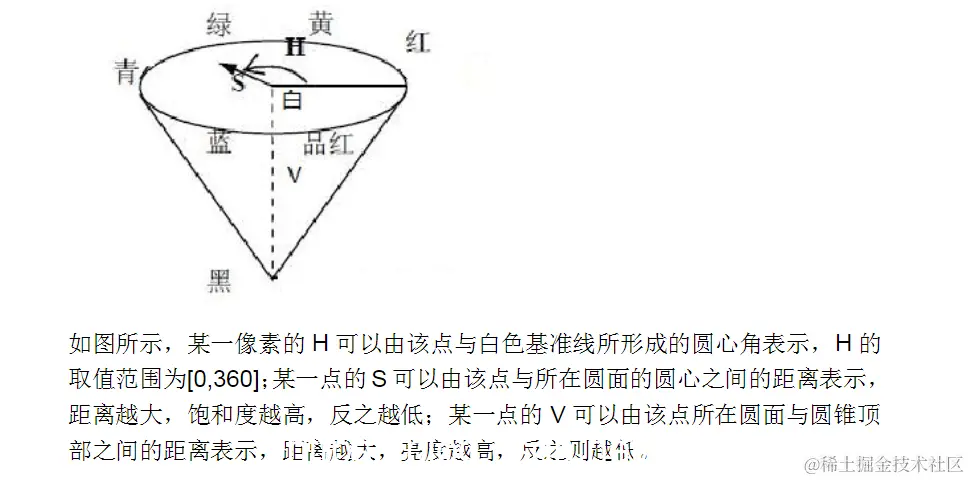 Hue(色调、色相):直接决定了什么颜色,RGB是通过三个值决定颜色,而HSV只通过H值就可以决定;