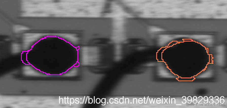 expand_gray填补了在分割图像时,由于需要抑制小的区域导致的区域之间的间隙(mode为image时),或者时在分割重叠区域时(mode为region时);这两种方式都是区域膨胀的结果。该算子的工作原理是在区域中添加一个像素宽的条带,并且其灰度值和区域边界上相邻的像素的灰度值最大落差不能超过参数threshold中设置的阈值(如下图,左图为未执行expand_gray,右图为执行后的mode=image)。对于“循环”类型的图像(例如方向图像),输出区域还会添加灰度差值至少为255 - Threshold的点。