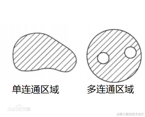 定义:复平面上的一个区域G,如果在其中任做一条简单闭曲线,而闭曲线的内部总属于G,就称G为单连通区域。一个区域如果不是单连通区域,就称为多连通区域。