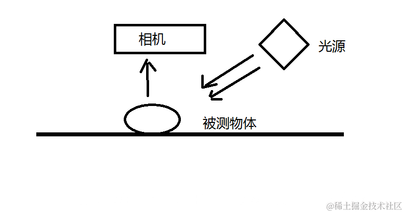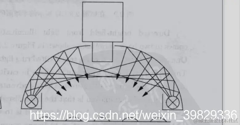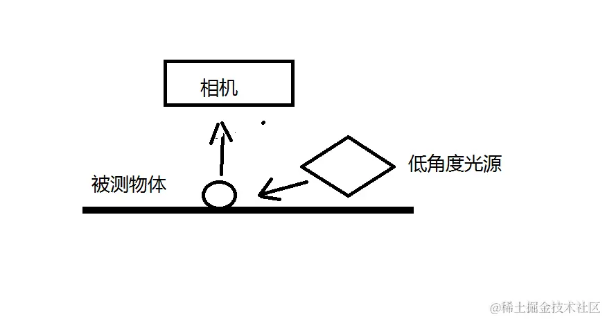 4、暗场照明:光源和被测物体呈一定的角度,使大部分光源不能反射到相机上,让少部分光或者特定的光反射到相机里;