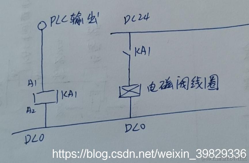 传感器的输出端接到中间继电器的线圈上A1,中间继电器线圈的另一段A2接在DC24上,需要明白的一点是,中间继电器的线圈必须有一个电压正和一个电压负,如果A1是正,那A2必须是负,如果A1是负,那A2肯定是正