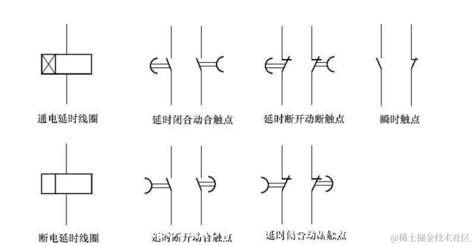 1、上图描述的符号是时间继电器的两种类型,第一种是通电延时时间继电器,也就是我们上面介绍的,线圈通电,延时一段时间后,延时常开触点闭合,延时常闭触点断开,但是有些时间继电器因为型号的不同,还可以同时带有瞬时触点,顾名思义,就是线圈一旦得电,瞬时常开就闭合,瞬时常闭就断开,和时间没有任何关系,这个和中间继电器一模一样;